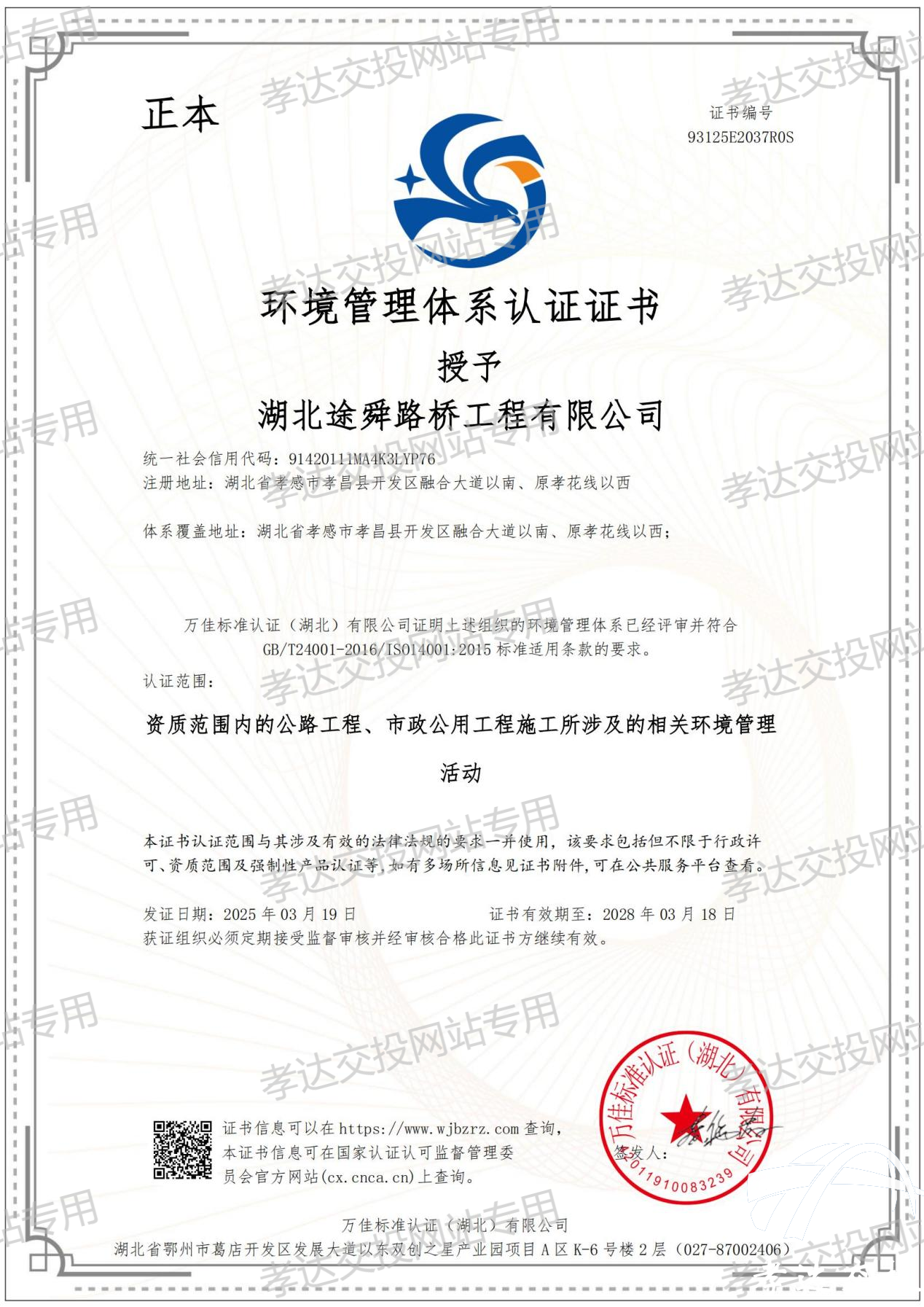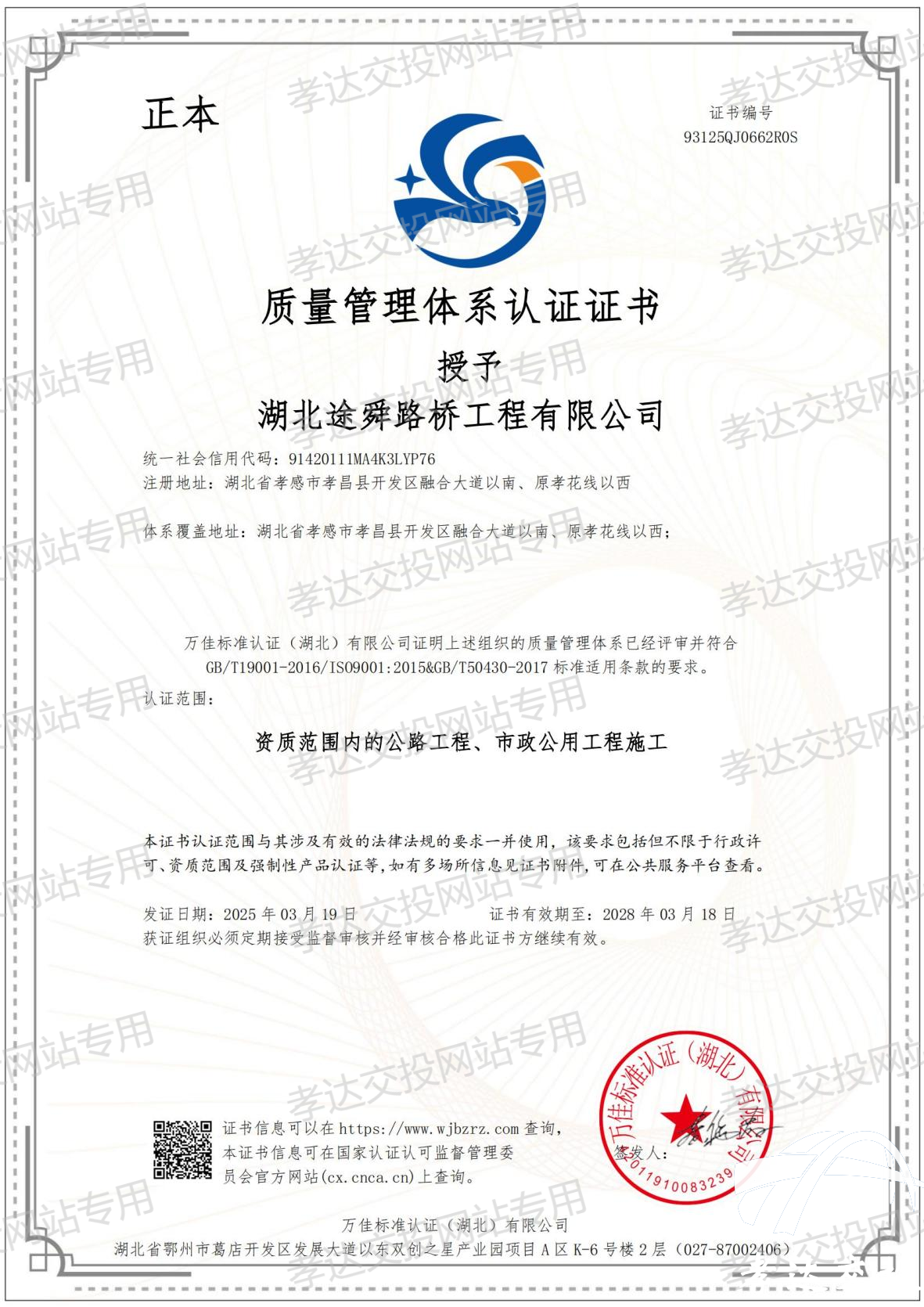 3月19日,孝達(dá)交投全資子公司——湖北途舜路橋工程有限公司,在順利通過中國質(zhì)量認(rèn)證中心萬佳標(biāo)準(zhǔn)認(rèn)證中心《質(zhì)量、環(huán)境和職業(yè)健康安全管理》三標(biāo)體系認(rèn)證審核后,取得三標(biāo)管理體系認(rèn)證證書。